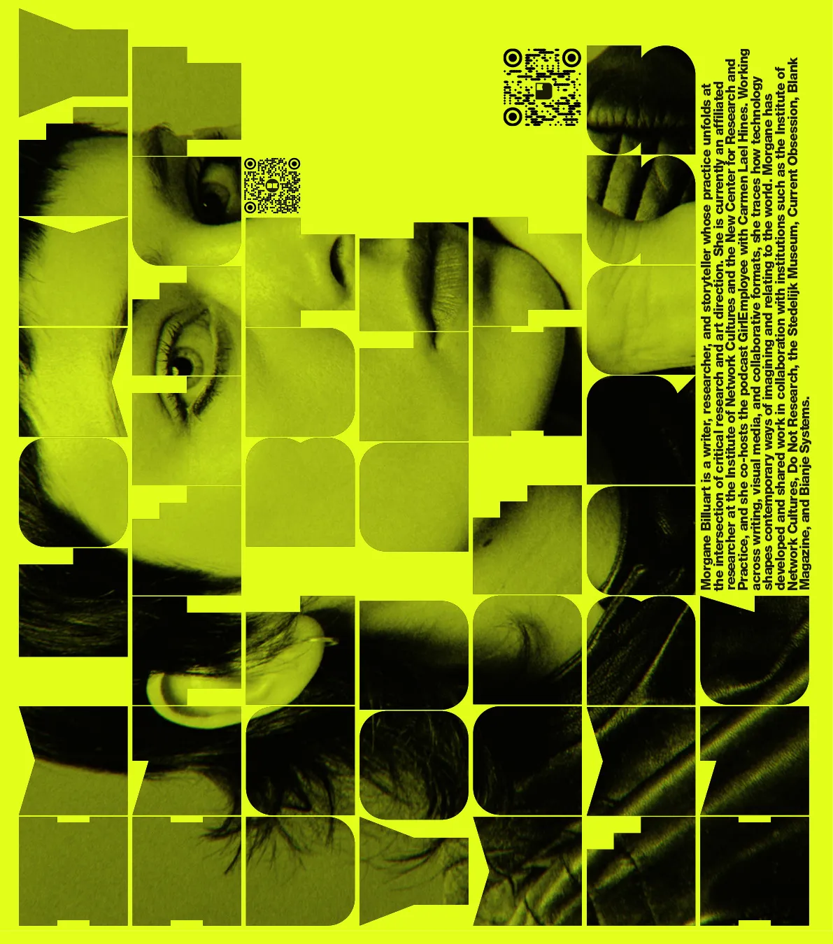Morgane Billuart is a writer, researcher, and storyteller whose practice unfolds at the intersection of critical research and art direction. She is currently an affiliated researcher at the Institute of Network Cultures and the New Center for Research and Practice, and she co-hosts the podcast GirlEmployee with Carmen Lael Hines. Working across writing, visual media, and collaborative formats, she traces how technology shapes contemporary ways of imagining and relating to the world. Morgane has developed and shared work in collaboration with institutions such as the Institute of Network Cultures, Do Not Research, the Stedelijk Museum, Current Obsession, Blank Magazine, and Bianje Systems.